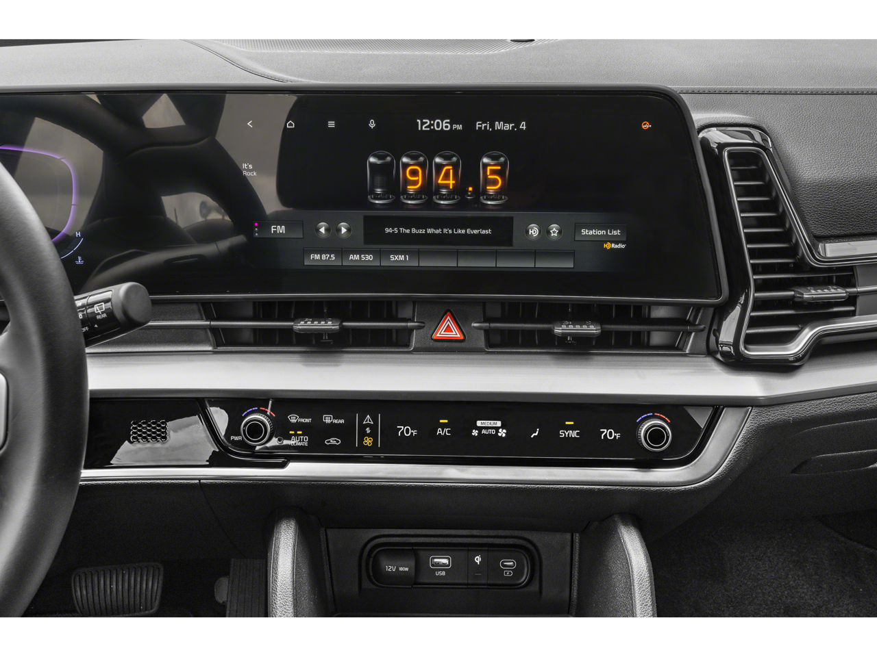 - Radio: AM/FM/HD Audio System -inc: 12.3" touchscreen w/navigation, 6 speakers, wired Apple Carplay and Android Auto, UVO telematics, voice recognition, SiriusXM, steering wheel mounted audio controls and Bluetooth® phone and streaming audio